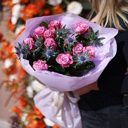 Букет "Базилио" из роз Меритим и веточек эрингиума