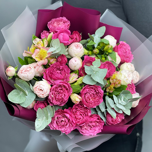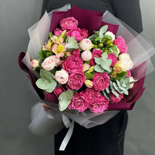 Букет "Мисс Диор" из кустовых пионовидных роз Джульетта, Мэнсфилд парк и альстромерий